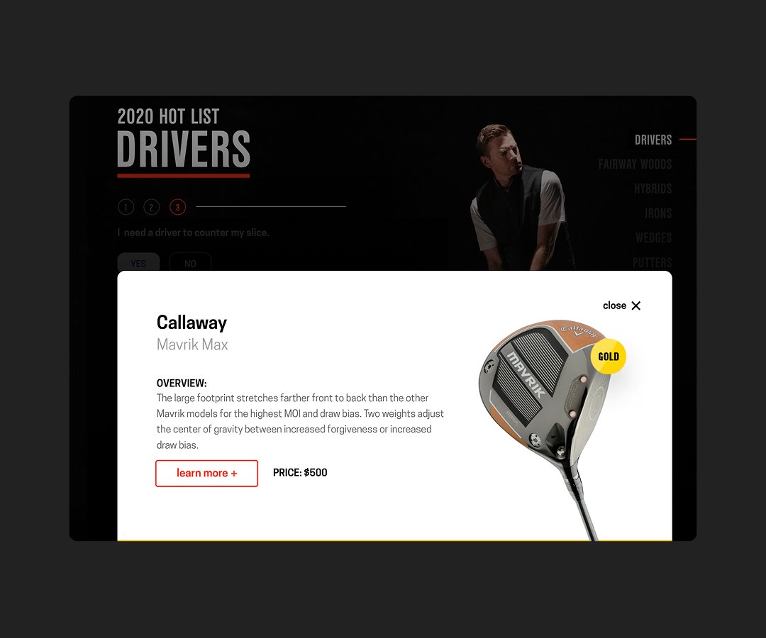 The goal of the Golf Digest Hot List Interactive Quiz was to transform Golf Digest’s annual equipment rankings into an intuitive, interactive experience that helps players quickly find the right gear for their game. By guiding users through a quiz based on skill level, preferences, and playing style, the experience simplifies complex equipment data into personalized recommendations, making it easier for golfers to choose clubs that match their needs.